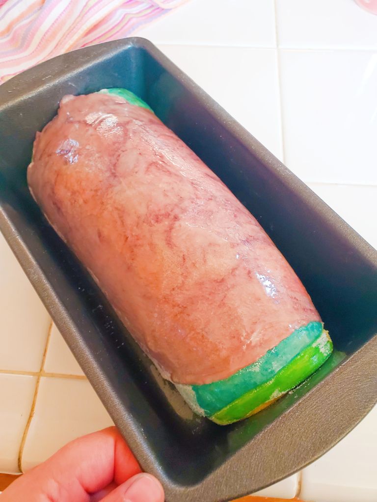 Now, roll up the colored dough into one large loaf. Place in a greased loaf pan, and set aside to allow it to rise once more.