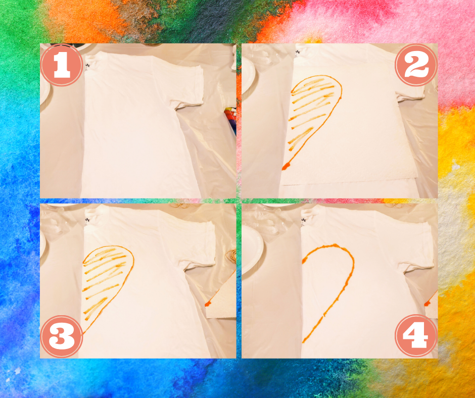 To begin, fold your t-shirt in half vertically and straighten out any wrinkles. Now, using a washable marker (make sure it’s washable so it’ll rinse away when you wash your shirt again later), make your heart template. Since the shirt is folded in half, you only need to draw a half heart (as shown in photo two). I chose to make a heart template first on a piece of paper towel and then placed it over the shirt to make sure I liked the size and shape. Once I was satisfied, I cut out my template and placed the paper towel on the shirt where I wanted the heart to appear against the folded edge and drew along the edge with the washable marker (as shown in photo three). (You don’t necessarily have to cut the half heart out; Since the paper towel is thin enough, you can just trace over the line, and the marker will bleed through to the shirt and create your half-heart shape.)