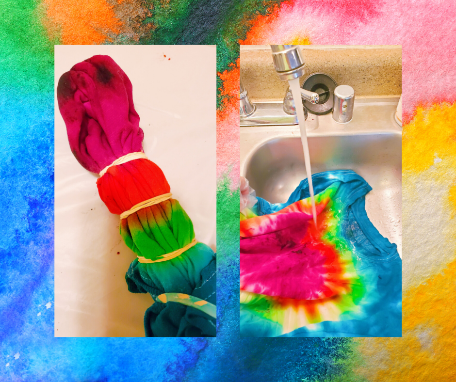 Now, take your shirt to the sink and rinse it out. This will help get out that excess dye. Keep rinsing your shirt until the water runs clear. At this point, it’s time to throw the t-shirt into the wash (make sure it’s the only thing in the washer!). Set your washer to the large load setting with the hottest water suitable for the fabric and put in only a small amount of laundry soap. Wash (and dry if you’d like) separately. If you air-dry your tie-dyed t-shirt, don’t let it rest wet on other items. Also, make sure to wash your tie-dyed shirt separately the first few washes so you don’t end up with other tie-dyed items (ha!).