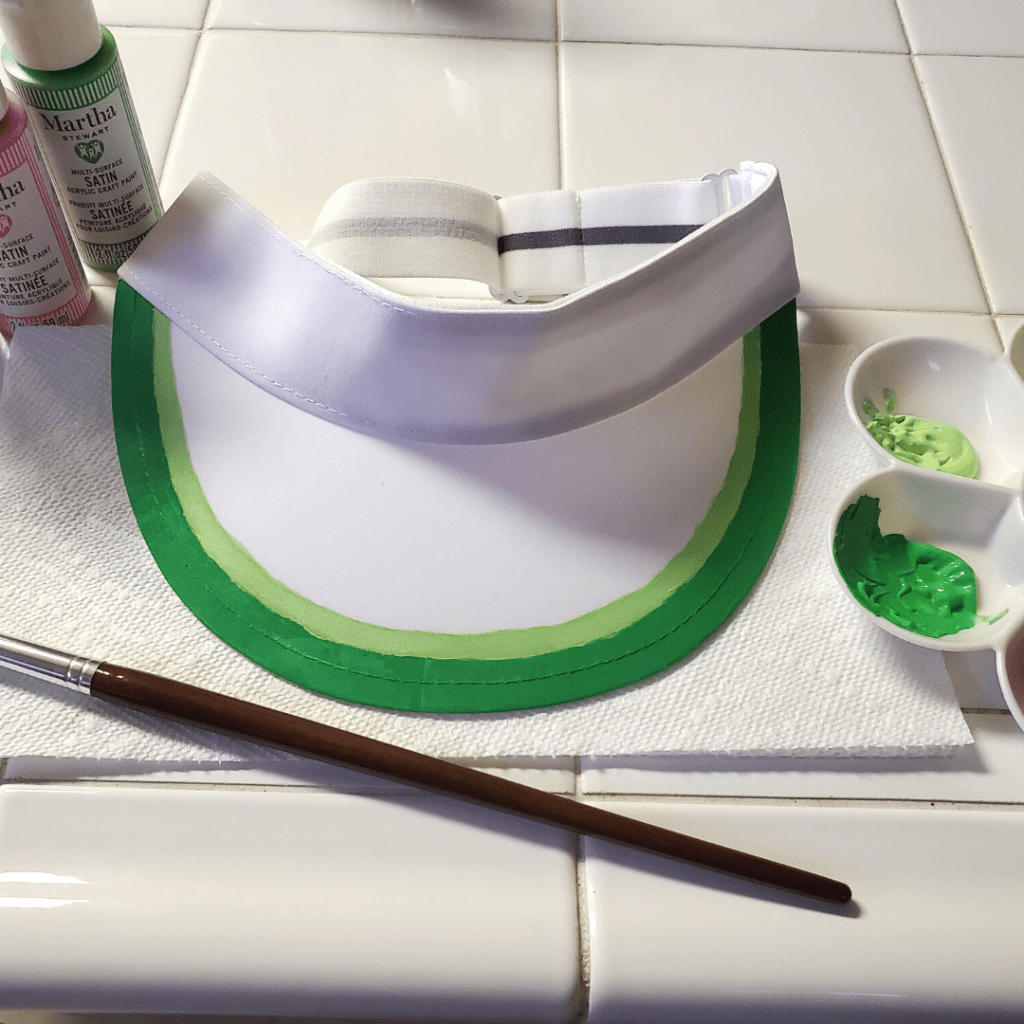 I took a pencil and outlined two thin half circles around the edge of the visor. I made the outer most section slightly thinker so the outer dark green rind was a little bit wider than the inner light green part of the rind (see the photo above!). Next, I painted in my dark green and light green sections, filling in the sections I drew, and let them dry.