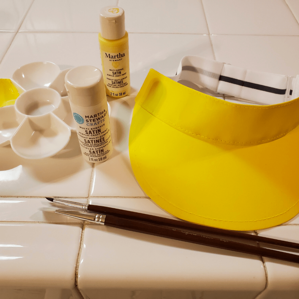 For my visor, I used two paints: a yellow paint (Martha Stewart Crafts® Multi-Surface Satin Acrylic Craft Paint in Sunshine Yellow) and a white paint (Martha Stewart Crafts® Multi-Surface Satin Acrylic Craft Paint in Wedding Cake). Again, I highly recommend using Martha Stewart’s paints, because the colors are so vibrant! The yellow I used here gave it such a bright pop, making it perfect for the lemon.
