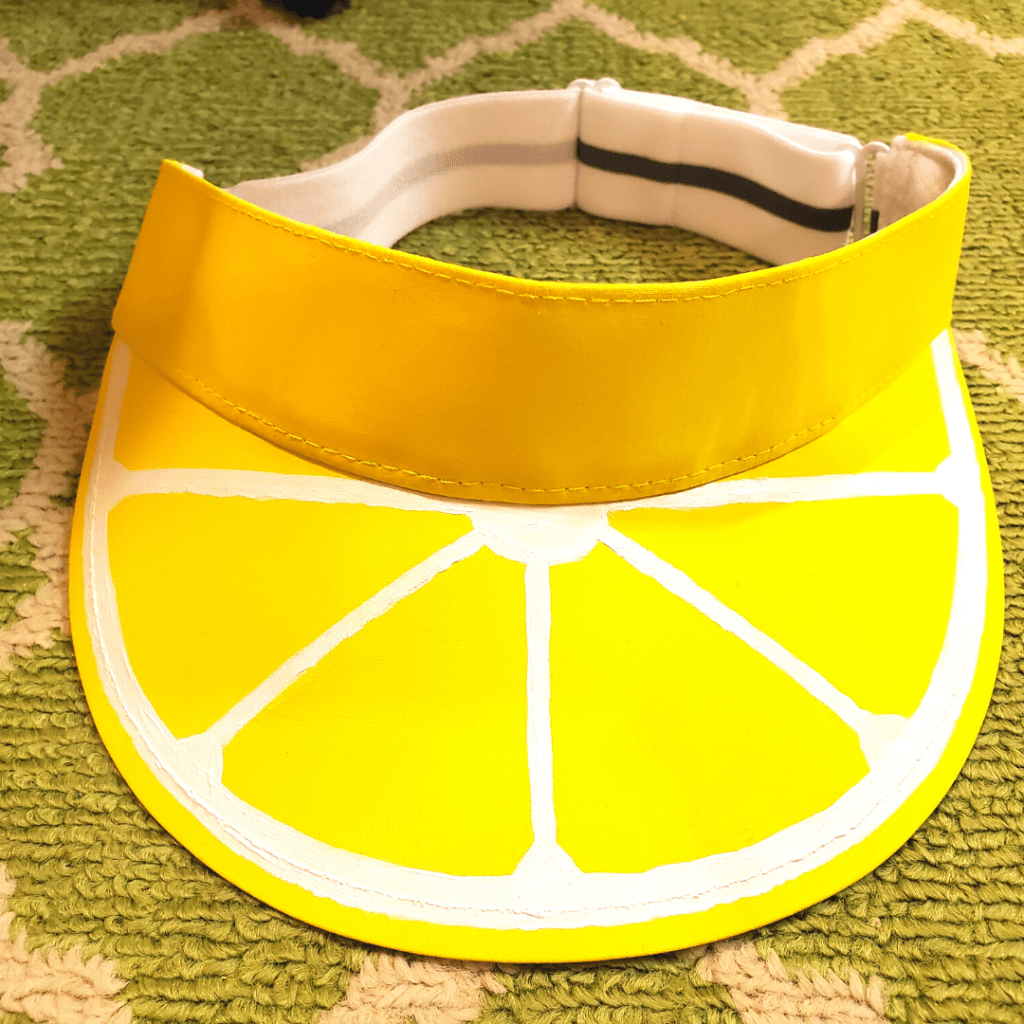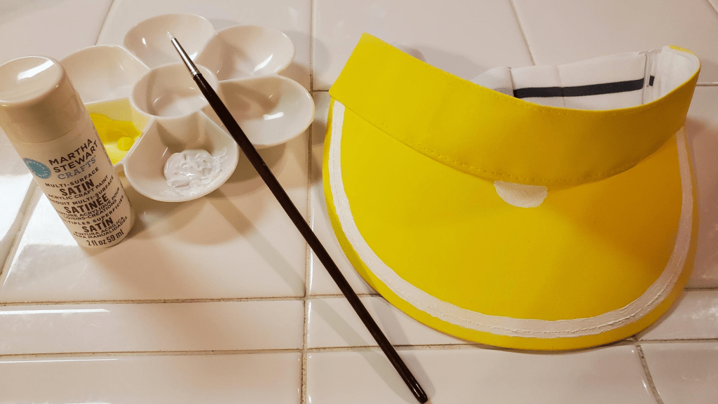 Once you have your visor painted entirely yellow and allowed it to dry, it’s time to paint the pith of the lemon. You can use a pencil to lightly mark where you paint the pith along the edge of the visor. I, however, just freehand the white section. Make sure to leave a little bit of yellow on the edge of the hat before the pith so it creates the rind of the lemon.