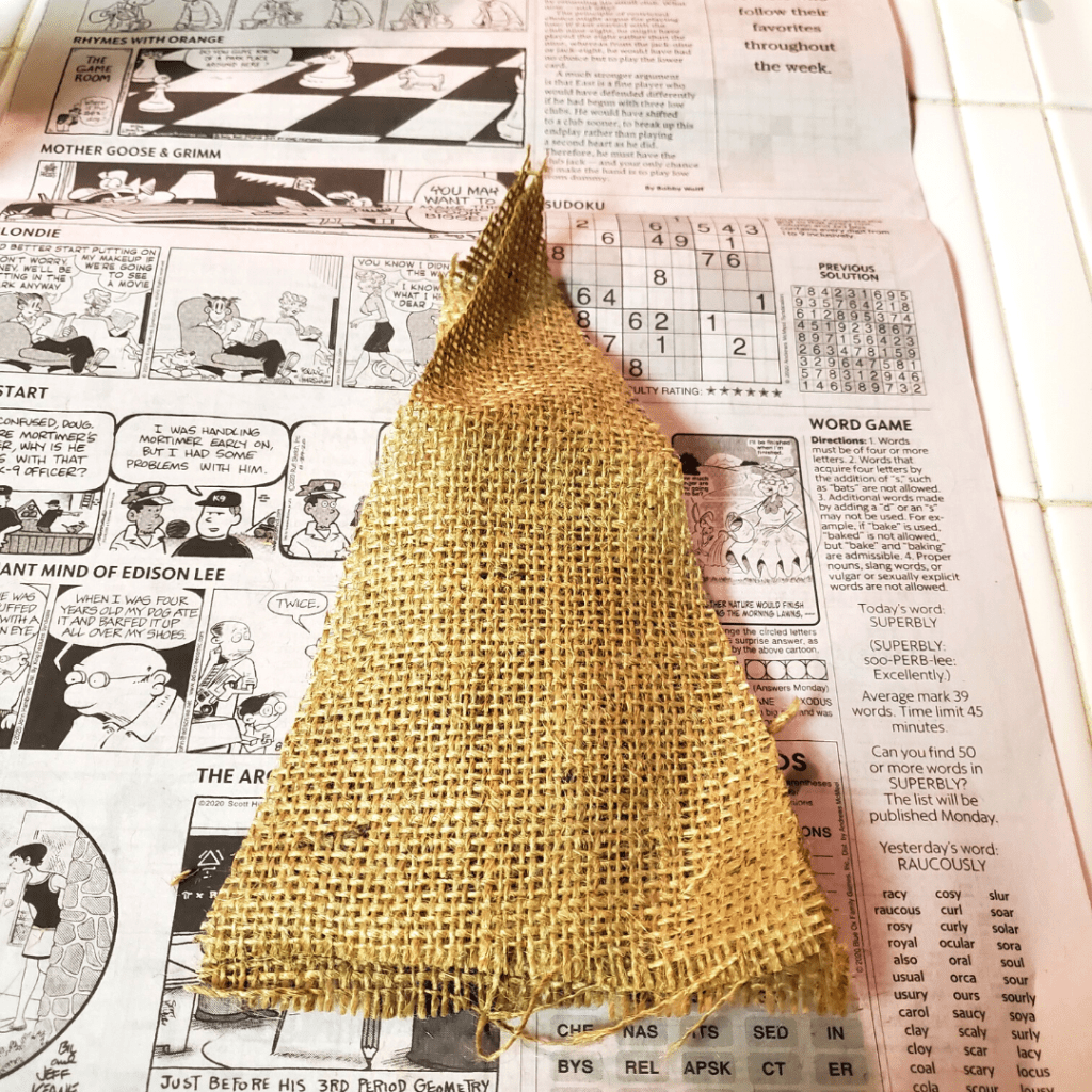 To begin making your candy corn, start by taking a rectangular strip of burlap and fold it in half. With your scissors, cut out a triangle. By folding the burlap in half before cutting, you’ll get two even triangular pieces for your candy corn. You can also use a piece of chalk to mark out your triangle and then just cut along the line. You can cut your triangles however big you’d like. When making these candy corn, I cut out different sizes so I could make a candy corn forest.
