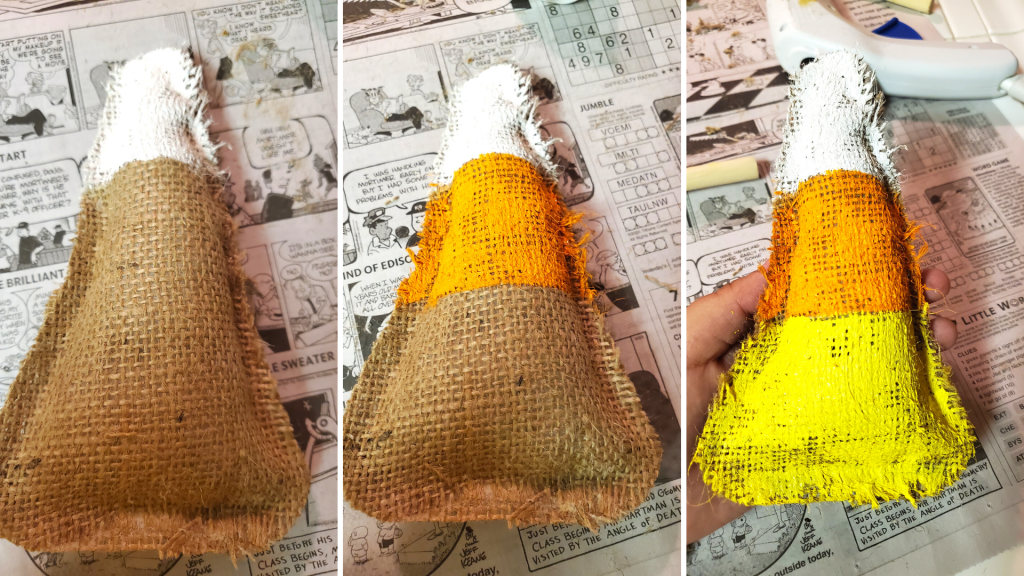 Of course, you can paint your candy corn whatever you’d like, but I decided to stick with the traditional candy corn colors: white, orange, and yellow. To paint my candy corn, I used some foam paint brushes since it helped the paint get into the small holes of the burlap fabric, but use whatever paint brushes you have on hand! I started by painting the top third of my candy corn with white paint. You can keep painting with a new paint brush (or clean off your one paint brush first). I painted the second third orange and the bottom third yellow.
