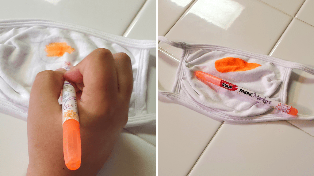 Once I was satisfied with the shape of the carrot nose and thought it looked centered (you can always gently erase your pencil markings and redo them until you are satisfied with the shape), I drew in the carrot nose with my Neon Orange Tulip Color Fabric Marker, gently erasing my pencil markings as I approached the edge of them with the fabric marker. I colored in the carrot nose until the white of the face mask was completely covered and I was satisfied with the coverage of the orange fabric maker.
