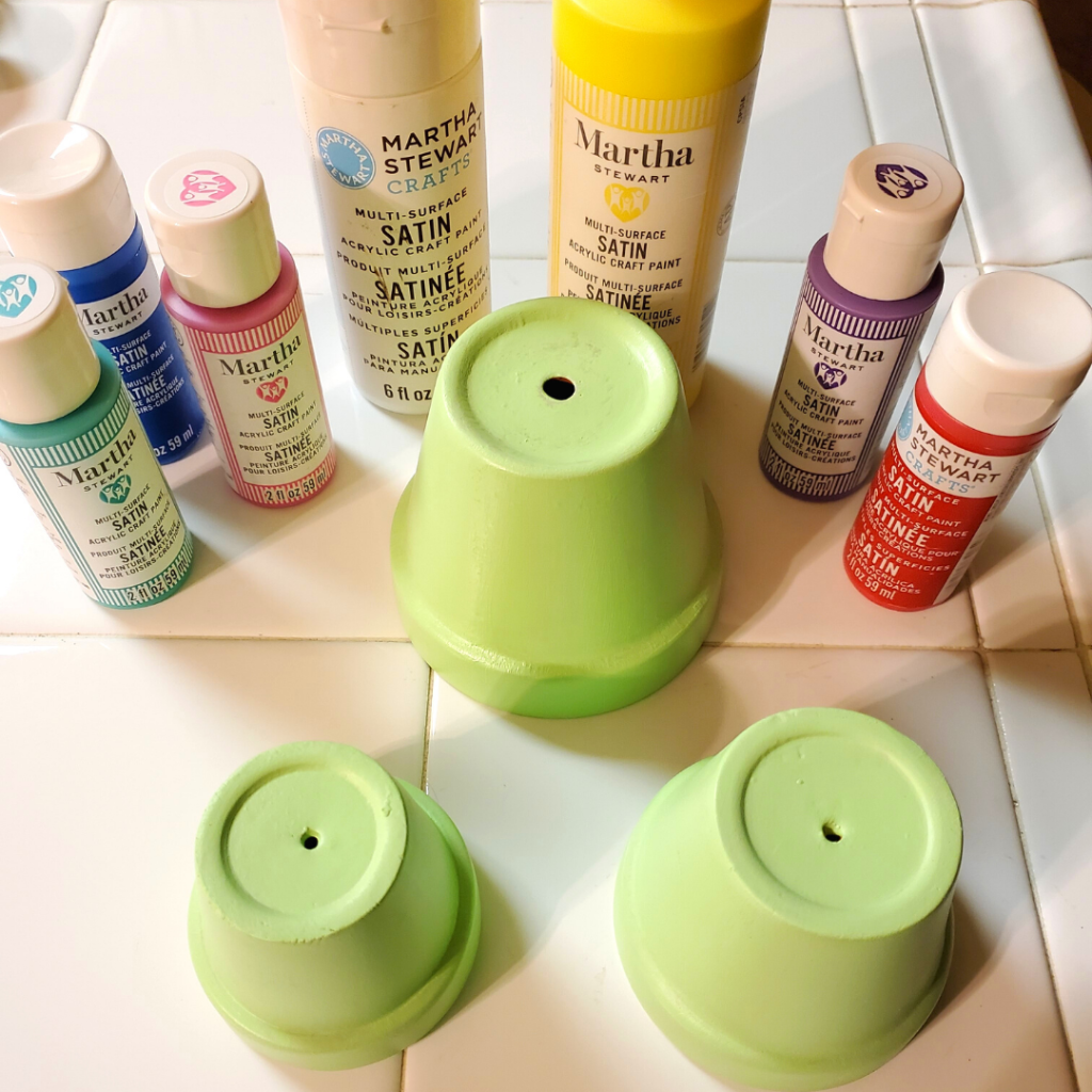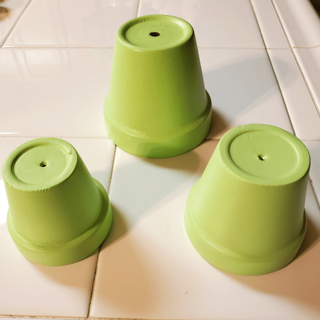 Start by painting each terra cotta pot with your base color. Since I wanted mine to look more like a traditional Christmas tree, I went with green paint (Martha Stewart’s Multi-Surface Satin Acrylic Craft Paint in Pistachio). However, you can paint the base of your tree whatever color you’d like to match your holiday aesthetic, whether that be a traditional green, a festive red, or even a bold pink!