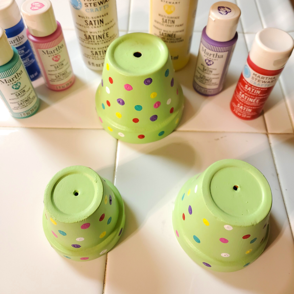 After painting each terra cotta pot, I set them aside to dry completely before adding on any embellishments.