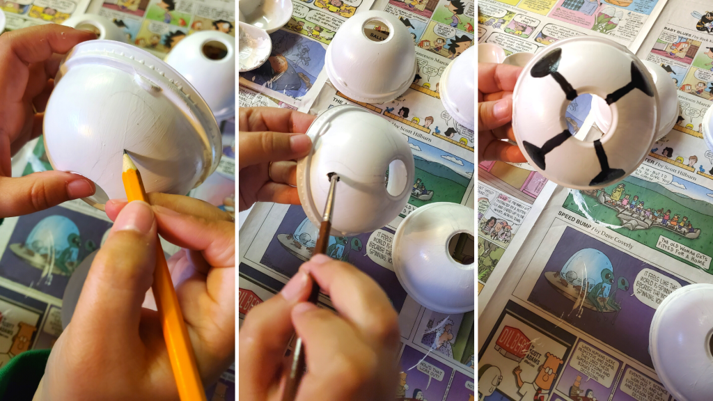Next, to make the bell look more realistic, paint on the slivers/openings on the bell. Taking one of the dome lids, add the openings onto what will be the bell’s base. I used a pencil to lightly trace out the shape before painting it in with black paint, creating a rounded teardrop-like shape towards the bottom of the lid (which will end up being the middle of the bell) and making a narrow line connecting it to the straw hole of the lid (see photo below).
