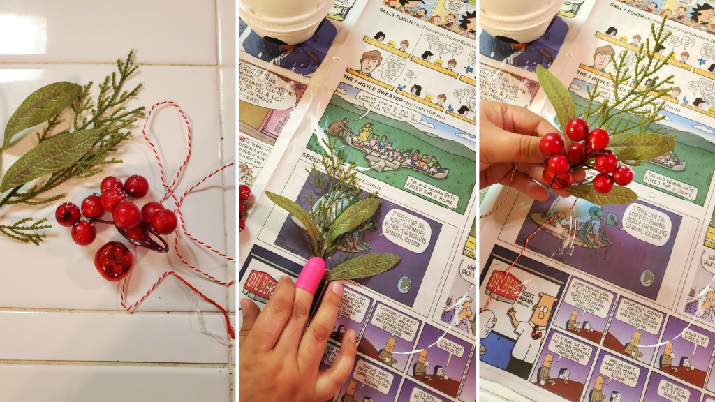 I found a greenery pick at Walmart and separated the berries and leaves from the stem to create more pieces of greenery to work with. Using some hot glue, I glued the leaves together, then tied some twine around the leaves and berries while also stringing on a small, red bell (to match the berries) so when I shook the bell, it jingled like a real bell. You can put together any greenery you’d like—use whatever matches your Christmas decor or the theme you are going for!