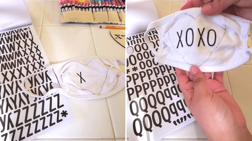 For the pair of Conversation Heart Face Masks that I made, I decided to opt for the phrases “XOXO” and “Be Mine” (for illustration purposes, I am showing you the “XOXO” mask). Taking the stickers, I lined them out on the mask within the traced-out heart and firmly pressed them down so they would stick to the mask (and they stuck on really well).