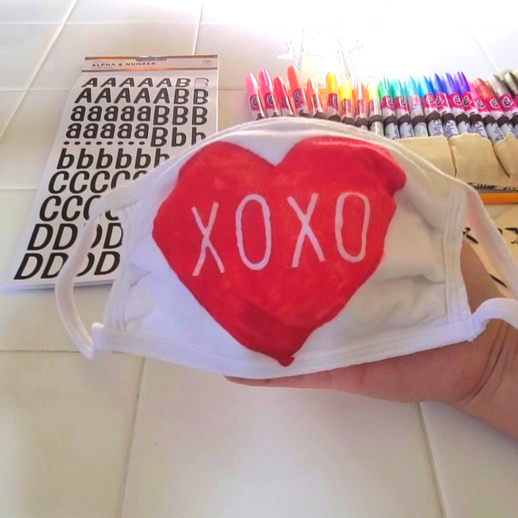 For the “XOXO” mask, I used my red fabric marker. Start by drawing over the pencil lines you made to trace out the heart first, then start filling in the heart. While the stickers adhered very well to the mask, make sure to still color over the letters with caution.