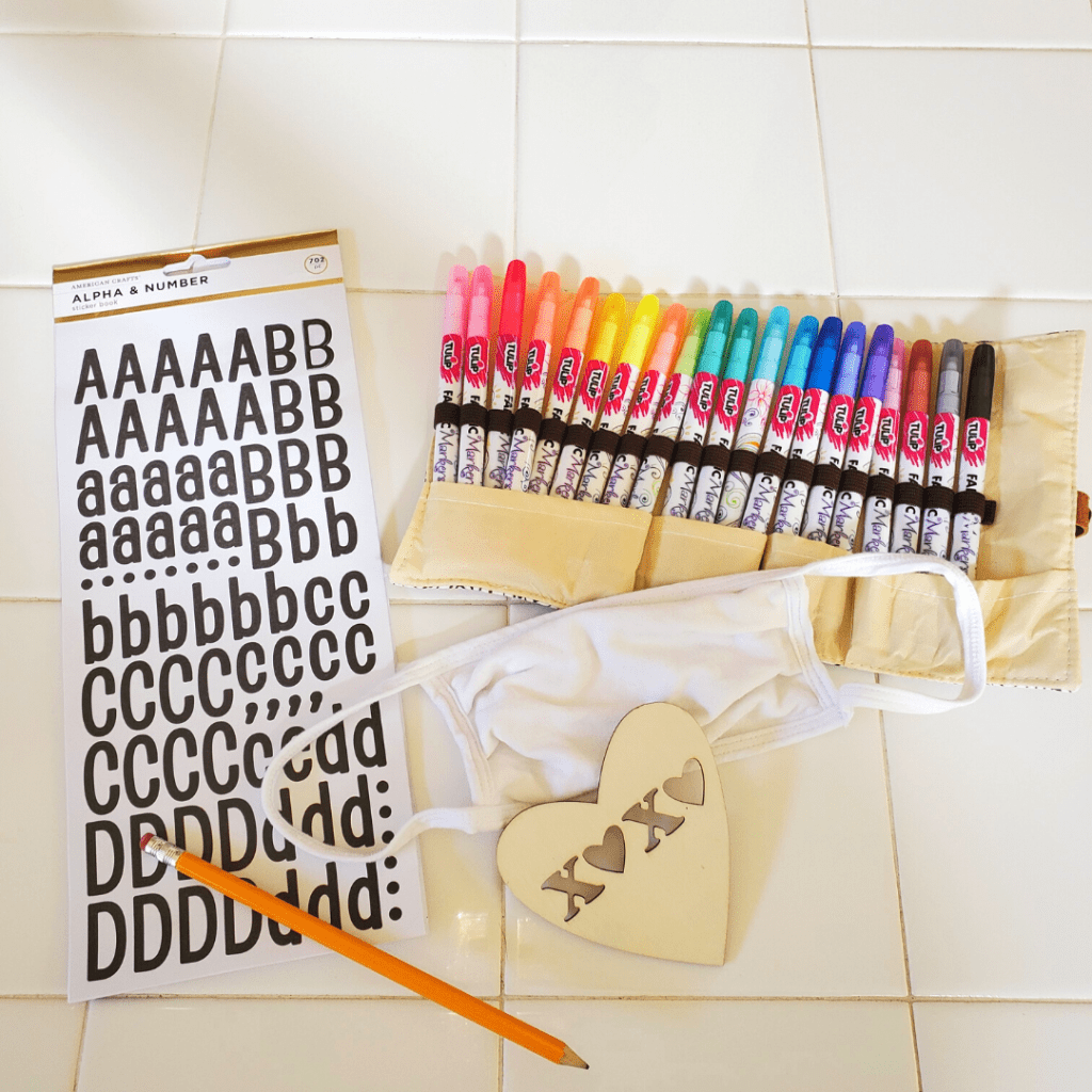 To make the phrase extra crisp on the mask, I opted to use stickers to place on the mask and color over so that, when I removed the stickers, the phrase would be clear and easily read. I used some alpha stickers from American Crafts that I found at Target (you can shop the stickers here through this affiliate link), and there worked perfectly for this project.