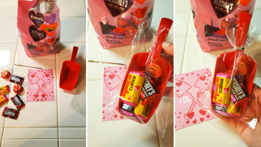 Simply place a small toy plastic shovel in a clear treat back (I used a 4×6 treat bag) and add some sweets treats to the blade of the shovel. I threw in some miniature Hershey’s and Reese’s Peanut Butter Cups. Next, use a twist tie to seal off the bag. Then, pair your little treat shovel with my printable card to totally make their Valentine’s Day!