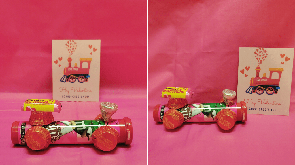 You can build your train using any Hearts Day candy you have on hand, but for mine, I used a tube of mini M&M’s, five mini Reese’s Peanut Butter Cups, a miniature Hershey’s, and a Hershey’s Kiss.
