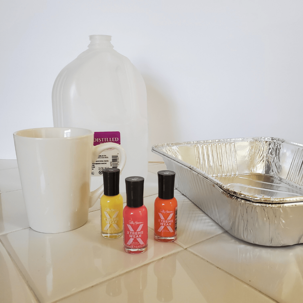 Begin by filling a container or tub that is deep enough for your mug with warm water. For the mug I got from Dollar Tree, I filled the disposable aluminum tray I had three-fourths of the way so it would be mostly but not completely submerged. It’s important not to have the mug be fully submerged so you won’t be applying the nail polish you’ll be using near the lip of the mug (that would not be safe when consuming a beverage from the mug).