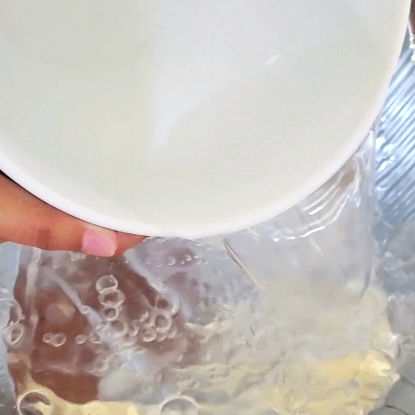 Begin by filling a container or tub that is deep enough for your candleholder with warm water. For the candleholders I used from Dollar Tree, I filled the disposable aluminum tray I had three-fourths of the way so they would be mostly but not completely submerged.