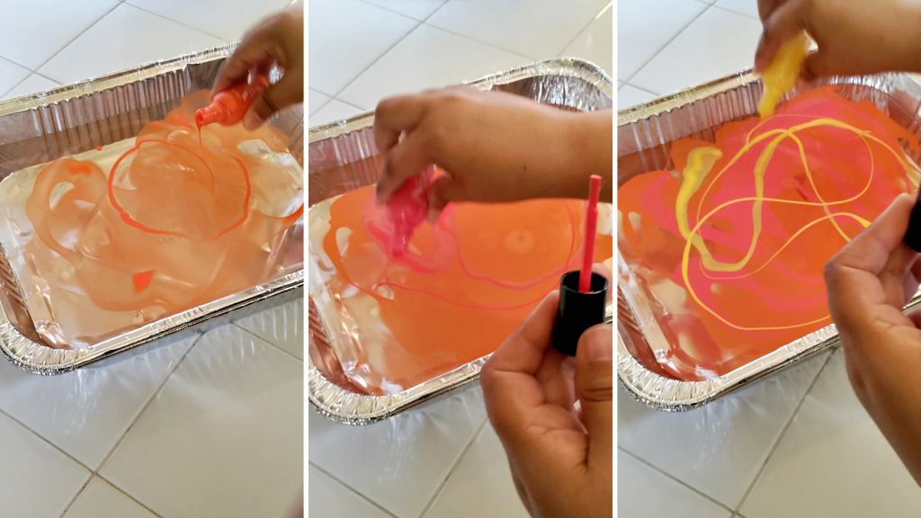 Once the nail polish is poured in, quickly swirl the nail polish with a skewer or toothpick to break up concentrated clumps and help create your marbled design.