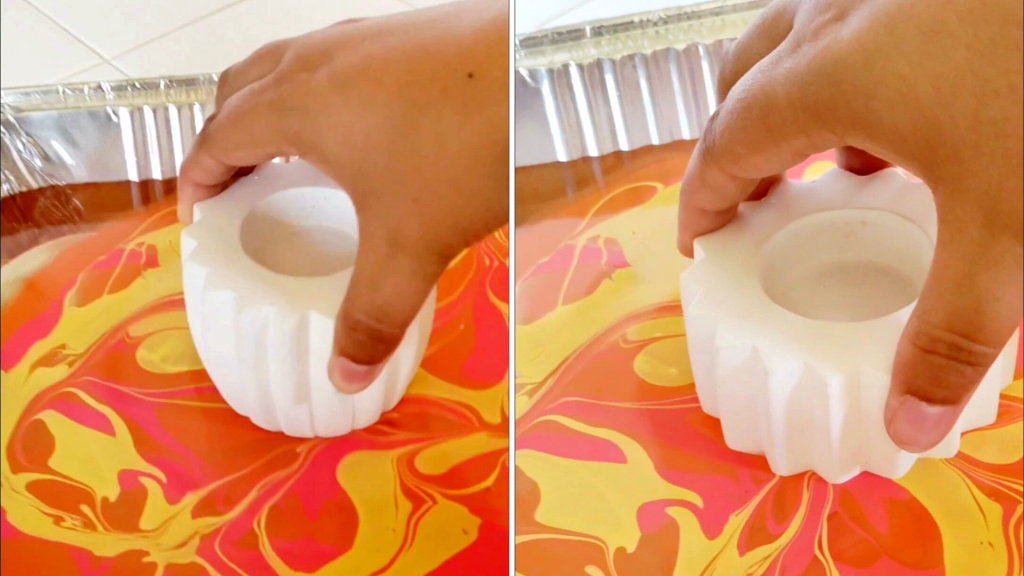Carefully lift the candleholder out of the water. The thin layer of nail polish should have transferred from the water to the candleholder. Set the candleholder aside on some paper or paper towel to dry.