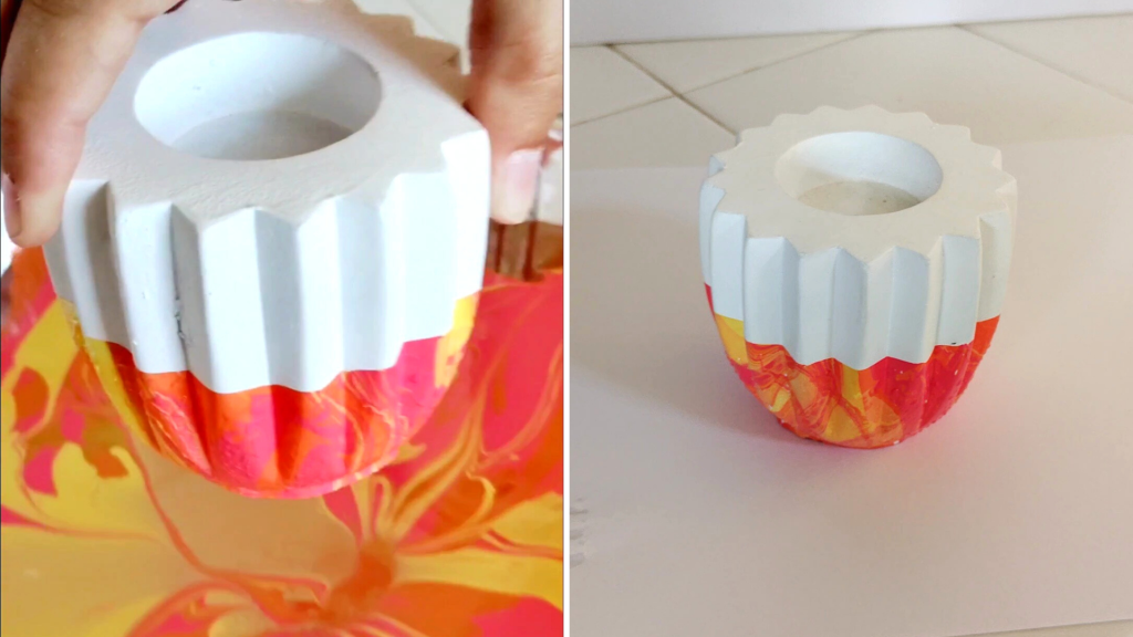 With the nail polish spread out thinly across the water, slowly dip your candleholder into the water, gently twirling the candleholder so it captures the nail polish and gets the marbled effect.