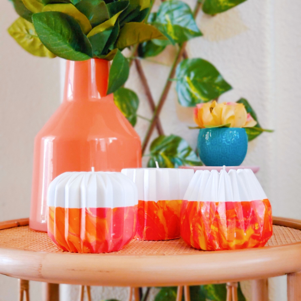 I used three colors for the candleholders I created: pink, coral, and yellow. I would highly suggest not using any more than three colors if you want multiple colors in your design. If left too long before dipping the candleholder, the nail polish will begin to clump together. If you are worried about having to work quickly, you can always dip the candleholder once for each individual color, allowing it to dry completely between each dipping.