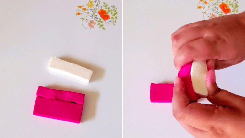 Start by gathering all of your modeling clay. Get creative with the colors you use, or be inspired by your favorite ice cream flavor! I chose to have my melted ice cream be pink. To get the color you’d like, you can always mix together the modeling clay. To get this pink shade, I mixed the magenta modeling clay with some white.