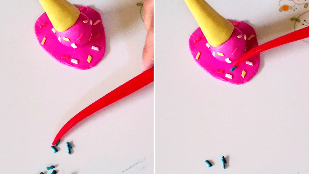 I rolled out small pieces of different colors of modeling clay and cut a small strip from the rolled-out clay. Then, cut each strip into smaller pieces to create sprinkles. With your modeling tools, gently pick up your sprinkles and press them around the scoop and melted ice cream base.