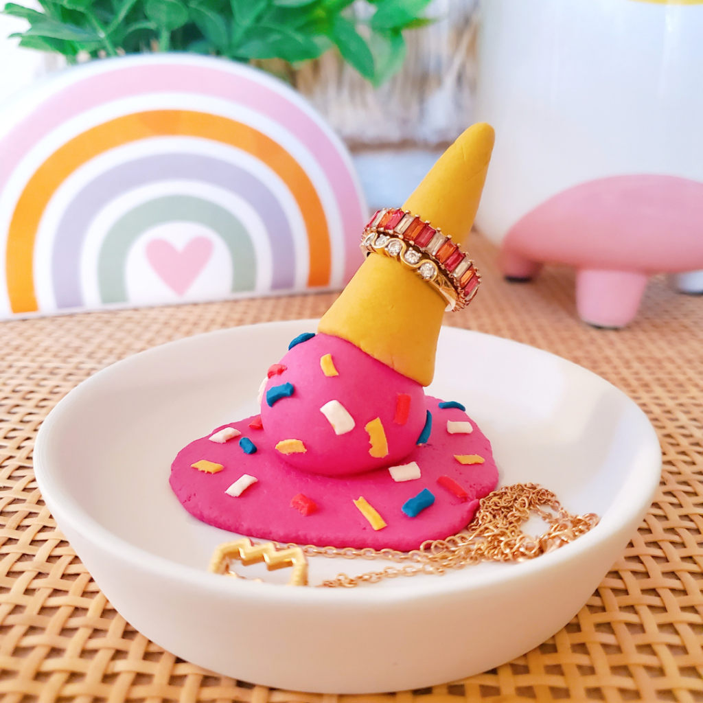Since it’s summertime, I thought what better way to keep your jewelry organized than with an ice cream-inspired jewelry dish!