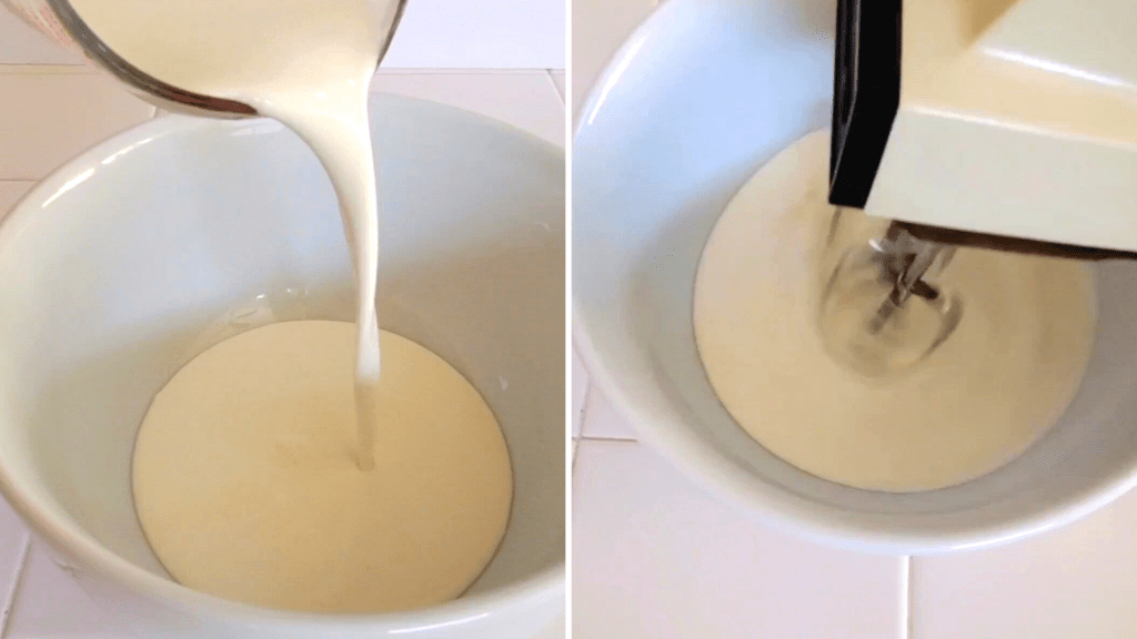 In a separate mixing bowl, add two cups of cold heavy whipping cream. With a hand mixer, beat the heavy whipping cream on medium-high speed until soft peaks form.