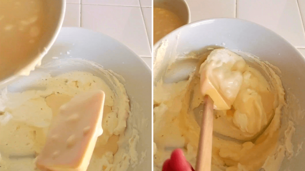 Using a rubber spatula, add a third of the cream to the sweetened condensed milk mixture and gently mix it to lighten the mixture. Then, add the mixture into the cream incrementally, gently folding the mixture into the cream as to not deflate the cream.