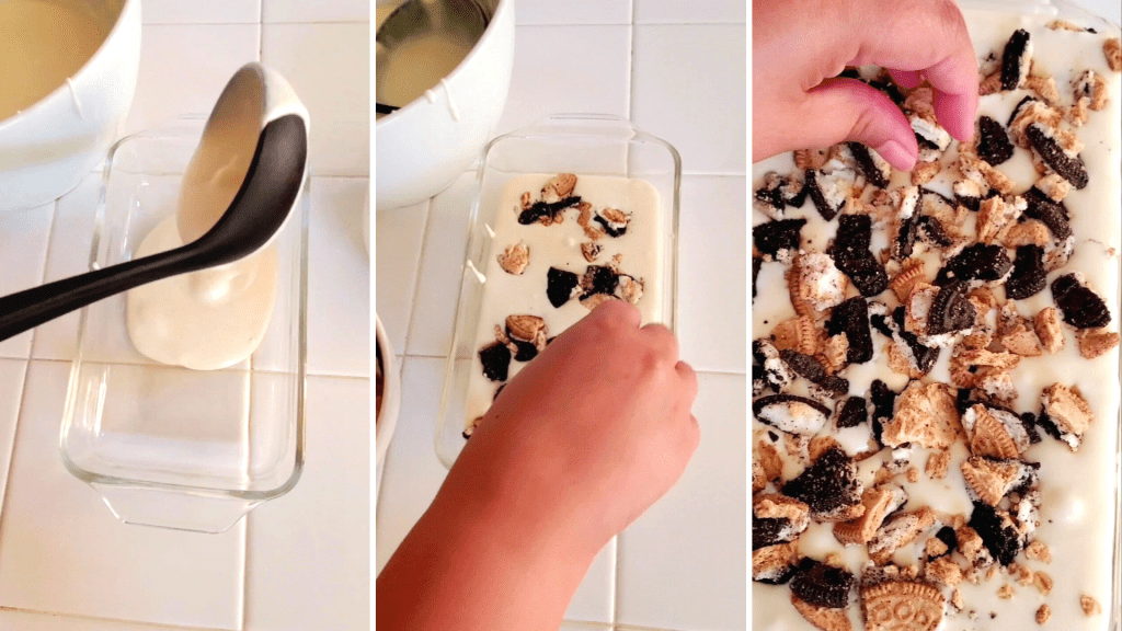 Grab a baking dish (a loaf pan or similar-sized glass baking dish works best) and add a third of the ice cream base into the bottom of the baking dish. Add a layer of crushed cookies on top of the layer.