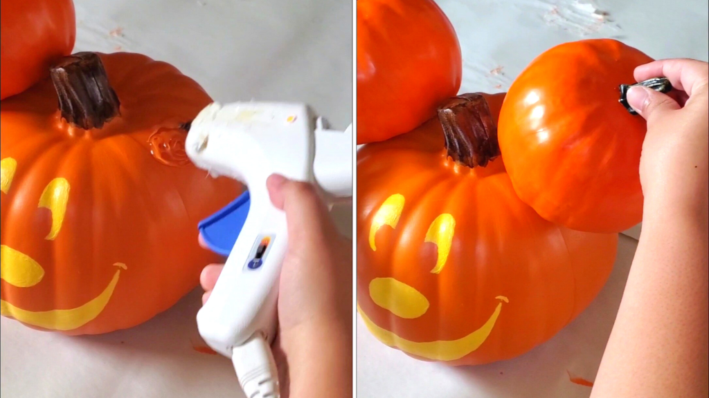 When the pumpkin has dried, you can add the ears! With a hot glue gun, apply hot glue on the top left of the large craft pumpkin and firmly press the base of one of the small craft pumpkins onto the hot glue. Keep holding the small pumpkin down unless the glue has set and the pumpkin is firmly stuck. Repeat the process for the other small craft pumpkin to create the right ear.